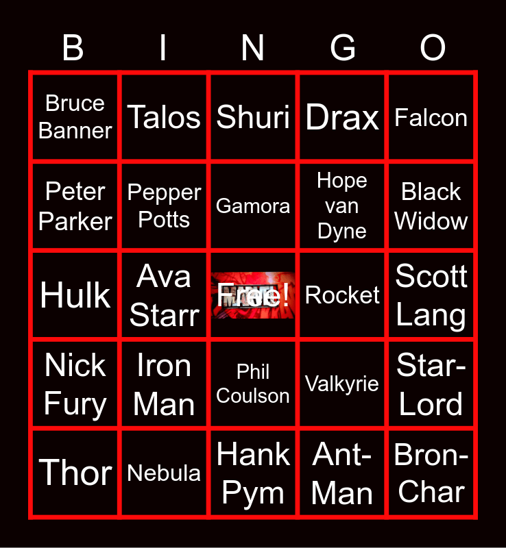 This bingo card has a free space and 55 words: Tony Stark, Thor, Wanda Maximoff, Bruce Banner, Hank Pym, Captain America, Pepper Potts, T'Challa, Hope van Dyne, Black Panther, Drax, Sam Wilson, Winter Soldier, Howard Stark, Clint Barton, Mantis, Falcon, Ava Starr, The Collector, Bron-Char, Rocket, Natasha Romanoff, Valkyrie, Shuri, Hawkeye, Gamora, Ant-Man, Peter Quill, Scott Lang, Star-Lord, Okoye, Carol Danvers, Groot, Vision, Peter Parker, Hulk, White Wolf, Nick Fury, Scarlet Witch, Doctor Strange, Talos, Peggy Carter, Thanos, Odin, Iron Man, Nebula, Loki, Yelena, Steve Rogers, Black Widow, Spider-Man, Captain Marvel, Wasp, Phil Coulson and Att-Lass.