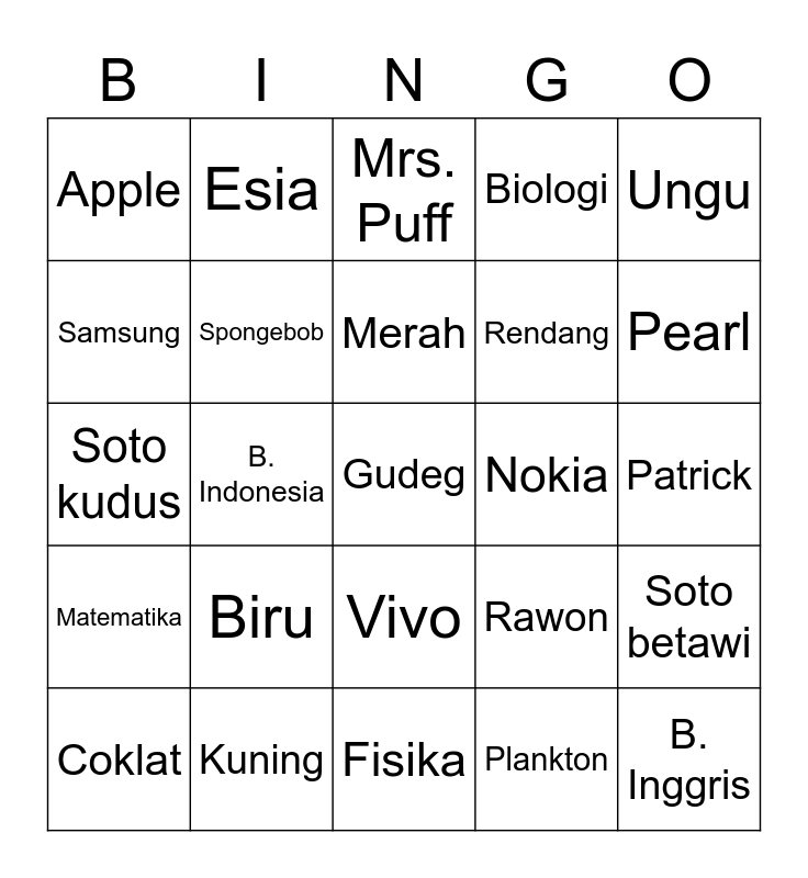 This bingo card has a free space and 24 words: Biru, Kuning, Merah, Coklat, Ungu, Apple, Samsung, Esia, Nokia, Vivo, Rendang, Soto kudus, Rawon, Soto betawi, Spongebob, Plankton, Patrick, Mrs. Puff, Pearl, B. Indonesia, B. Inggris, Matematika, Biologi and Fisika.