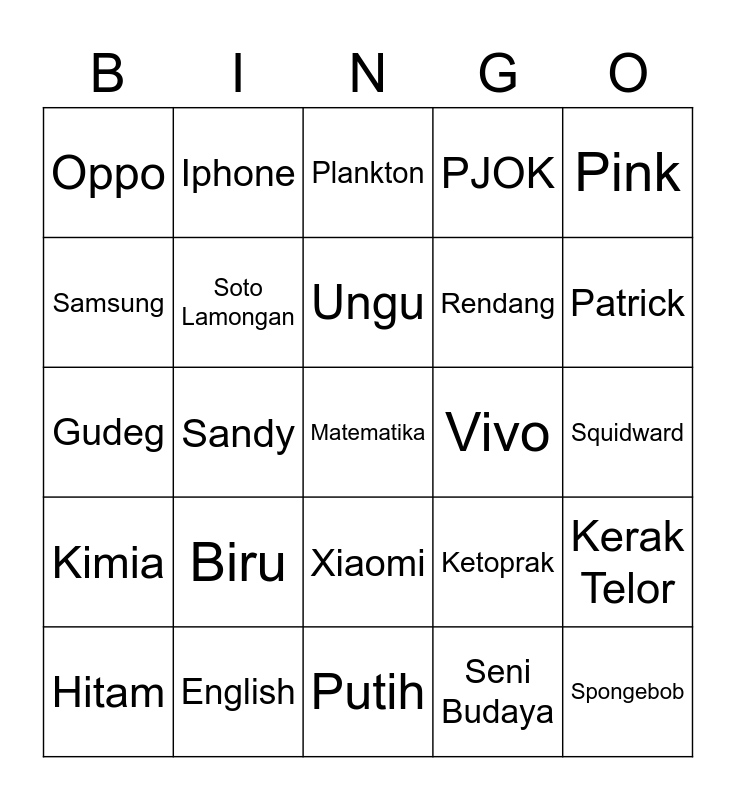 This bingo card has 25 words: Biru, Putih, Ungu, Hitam, Pink, Oppo, Samsung, Iphone, Vivo, Xiaomi, Rendang, Gudeg, Ketoprak, Kerak Telor, Soto Lamongan, Spongebob, Squidward, Plankton, Patrick, Sandy, Matematika, English, Kimia, PJOK and Seni Budaya.
