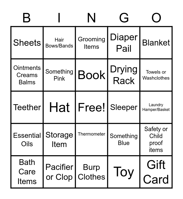 This bingo card has a free space and 45 words: Diaper Bag, Gift Card, Spoons, Bath Care Items, Socks, Toy, Grooming Items, Sippy Cups or Bowls, Blanket, Pacifier or Clop, Diaper Pail, Sleeper, Thermometer, Storage Item, Something Homemade, Burp Clothes, Nursing Items, Teether, Cowgirl Themed, Towels or Washclothes, Hair Bows/Bands, Diapers, Babysitting, Sheets, Animal Themed, Laundry Hamper/Basket, Onesie, Stuffed Animal, Something Blue, Essential Oils, Dress, Safety or Child proof items, Booties, Meals, Swaddle, Hat, Personal Gift for Shelly, Bottles or Brushes, Baby Gate, Book, Ointments Creams Balms, Drying Rack, Wipes, Something Pink and Purple or Lavender Item.
