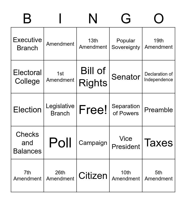 This bingo card has a free space and 44 words: 4th Amendment, 5th Amendment, 6th Amendment, 7th Amendment, 8th Amendment, 10th Amendment, 13th Amendment, 15th Amendment, 19th Amendment, 26th Amendment, Popular Sovereignty, Separation of Powers, Campaign, Poll, Gerrymandering, Citizen, Armed Forces, Election, Supreme Court, Declaration of Independence, Amendment, Nominee, Senate, Executive Branch, Constitutional Government, Preamble, Democracy, President, Vice President, Checks and Balances, Constitution, Taxes, Candidate, Justice, Legislative Branch, Veto, Judicial Branch, House of Representatives, Bill of Rights, Electoral College, Senator, Representative, 1st Amendment and 2nd Amendment.