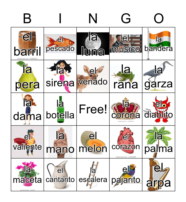 This bingo card has 31 images, a free space and 31 words: la campana, el cantarito, el venado, el cazo, la bandera, el barril, la botella, la escalera, la rana, el arpa, la maceta, la mano, el pajarito, la bota, el valiente, el nopal, el melon, la corona, el diablito, el tambor, el pescado, el gorrito, el corazon, la garza, la dama, la sirena, la luna, el musico, la palma, la pera and el pino.