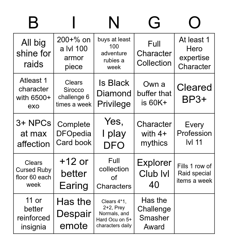 This bingo card has a free space and 24 words: Clears Cursed Ruby floor 60 each week, Has the Despair emote, Full collection of Characters, Explorer Club lvl 40, At least 1 Hero expertise Character, All big shine for raids, 200+% on a lvl 100 armor piece, buys at least 100 adventure rubies a week, Own a buffer that is 60K+, Fills 1 row of Raid special items a week, Atleast 1 character with 6500+ exo, Clears Sirocco challenge 6 times a week, Has the Arad attendance award, Character with 4+ mythics, Cleared BP3+, 11 or better reinforced insignia, Complete DFOpedia Card book, Is Black Diamond Privilege, Full Character Collection, Every Profession lvl 11, 3+ NPCs at max affection, +12 or better Earing, Clears 4*1, 2+2, Prey Normals, and Hard Ocu on 5+ characters daily and Has the Challenge Smasher Award.