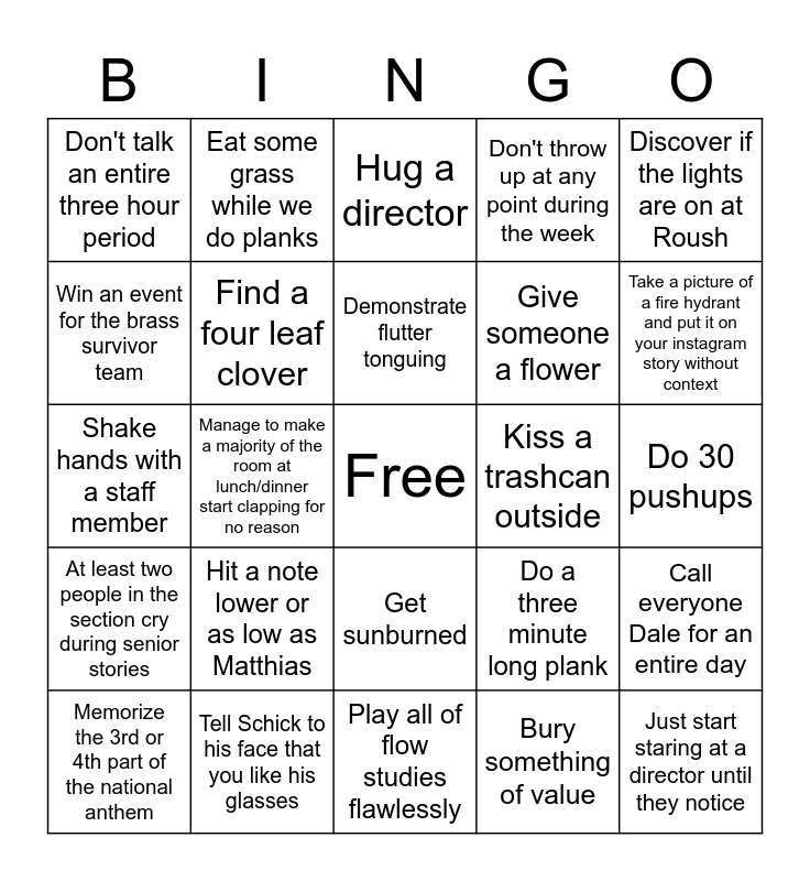This bingo card has a free space and 54 words: Matthias gets yelled at for wearing a banana costume, At least two people in the section cry during senior stories, The directors get water poured on them, Memorize all the pregame music, Get sunburned, Receive and individual compliment from a director, Don't throw up at any point during the week, Lick your mello, Win an event for the brass survivor team, Tell Berning to his face that you like how he's dressed, Don't talk an entire three hour period, Memorize all Part 1 music, Tell Schick to his face that you like his glasses, Memorize the 3rd or 4th part of the national anthem, Brass wins survivor, Play all of flow studies flawlessly, Just start staring at a director until they notice, Give someone a flower, Don't complain about the turf an entire block at Roush, Do 30 pushups, Do a three minute long plank, Speak a different language for three hours, Kiss a trashcan outside, Discover if the lights are on at Roush, The band gets ice cream at some point, Eat some grass while we do planks, Take a picture of a dead bird, Do a flip lol, The whole section wears bucket hats together, Bury something of value, Make and wear a flower crown, Go a whole three hours without sunglasses or a hat, Be the first in line for food, Chase after the golf cart after the directors drive away, Hug a director, Wear sunglasses an entire day, Shake hands with a staff member, Call everyone Dale for an entire day, Sneeze and have no one say bless you, Find a four leaf clover, Either eat a bug, or carry it around an entire day safely, Find and take a picture of a cloud that looks like a sad bear, Talk for a full minute about something you think is cool, Gather a group of at least four people to "say grace" before eating, Hit a note lower or as low as Matthias, The band does box drill at at least 200 bpm, Successfully point out southwest without using your phone, Demonstrate double tonguing, Demonstrate flutter tonguing, Manage to make a majority of the room at lunch/dinner start clapping for no reason, Take a picture of a fire hydrant and put it on your instagram story without context, In one try, say the alphabet faster than Matthias, Tell me how big an 8 to 5 step size is in inches and Take a picture of the time at 4:03 p.m..