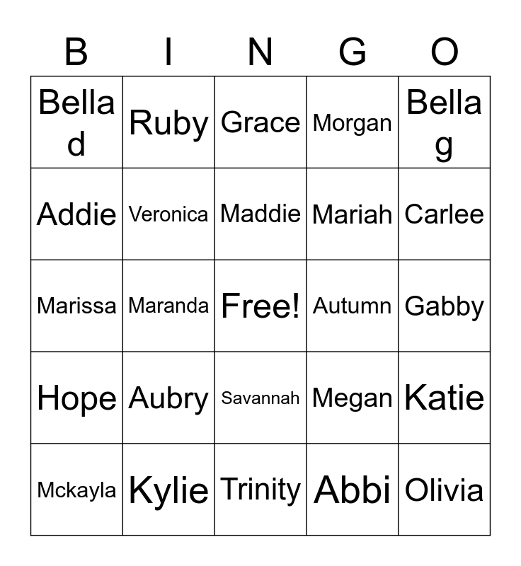 This bingo card has a free space and 24 words: Aubry, Kylie, Maddie, Mckayla, Bella g, Bella d, Addie, Ruby, Autumn, Savannah, Mariah, Marissa, Megan, Katie, Veronica, Abbi, Gabby, Grace, Carlee, Maranda, Olivia, Hope, Morgan and Trinity.