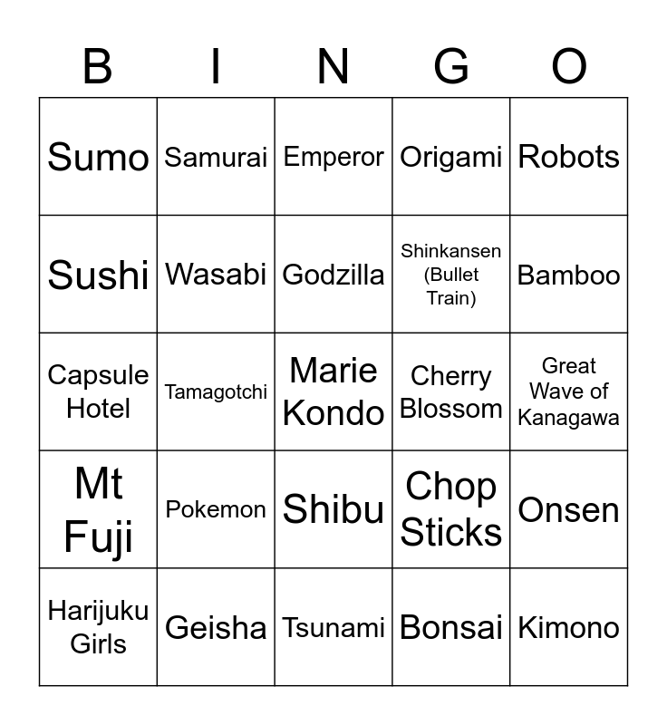 This bingo card has a free space and 24 words: Pokemon, Geisha, Godzilla, Harijuku Girls, Robots, Sumo, Sushi, Samurai, Cherry Blossom, Shibu, Shinkansen (Bullet Train), Capsule Hotel, Chop Sticks, Onsen, Wasabi, Bonsai, Great Wave of Kanagawa, Emperor, Bamboo, Tamagotchi, Kimono, Mt Fuji, Origami and Tsunami.