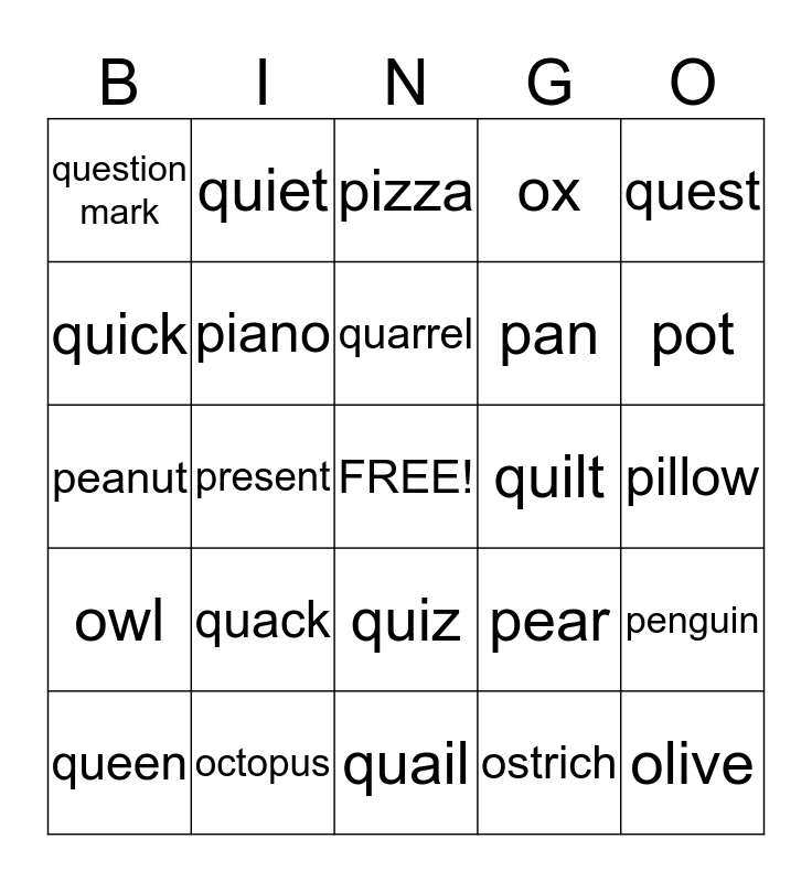 This bingo card has a free space and 25 words: quack, quail, quarrel, queen, quest, question mark, quick, quiet, quilt, quiz, pan, peanut, pear, penguin, piano, pig, pillow, pizza, pot, present, olive, octopus, owl, ox and ostrich.