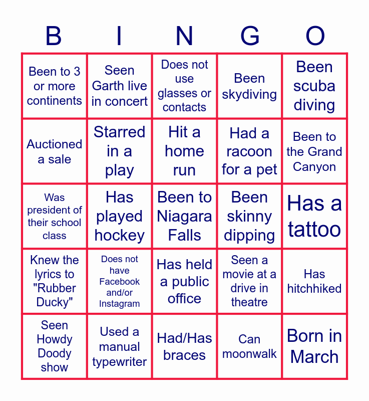 This bingo card has 65 words: Worn a poodle skirt, Seen Ringling Brothers circus, Been to Tijuana Mexico, Has hitchhiked, Done Chinese fire drill, Visited Statue of Liberty, Seen Garth live in concert, Made a basket from half court, Hit a home run, Driven a school bus, Has held a public office, Lived outside of the US, Has a tattoo, Been scuba diving, Has 4 or more siblings, Auctioned a sale, Has played hockey, Been to 3 or more continents, Has a true nickname, Had a racoon for a pet, Does not have Facebook and/or Instagram, Knew the lyrics to "Rubber Ducky", Been skydiving, Made a hole in one, Completed a marathon, Had an 8 track player, Had phone # that began with a word, Played lacrosse, Been to Niagara Falls, Published a book, Seen Howdy Doody show, Played Pacman, Served in the military, Tested positive for Covid, Seen a movie at a drive in theatre, Used a manual typewriter, Seen a tornado live in person, Was president of their school class, Can moonwalk, Speaks 2 or more languages, Starred in a play, Owned a pee shooter, Been skinny dipping, Had a leisure suit, Flown a plane, Been to Disneyland CA, Been to the Grand Canyon, Seen Elvis live in concert, Born in March, Is afraid of spiders, Is wearing yellow, Has blue eyes, Has said the word "Rona or Vid", Had/Has braces, Doesn't like chocolate, Never gotten a speeding ticket, Never broken a bone, Does not use glasses or contacts, Saw the news the day Kennedy was shot, Doesn't like pizza, Can name all 7 dwarfs, Played backseat bingo, Drives a motorcycle, Is an OU fan and Know someone who put a dead skunk in/under a school.