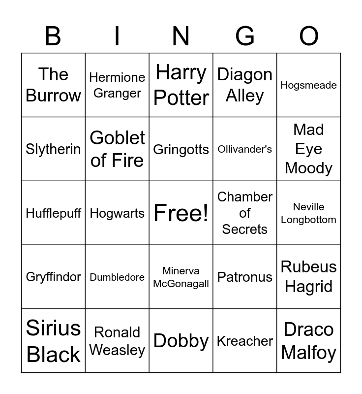 This bingo card has a free space and 29 words: Sirius Black, Lord Voldemort, Hogwarts, Severus Snape, The Burrow, Harry Potter, Goblet of Fire, Dumbledore, Chamber of Secrets, Ronald Weasley, Neville Longbottom, Draco Malfoy, Dobby, Kreacher, Mad Eye Moody, Tonks, Minerva McGonagall, Gryffindor, Hogsmeade, Hufflepuff, Patronus, Ravenclaw, Ollivander's, Slytherin, Diagon Alley, Hermione Granger, Rubeus Hagrid, Gringotts and Weasleys' Wizard Wheezes.