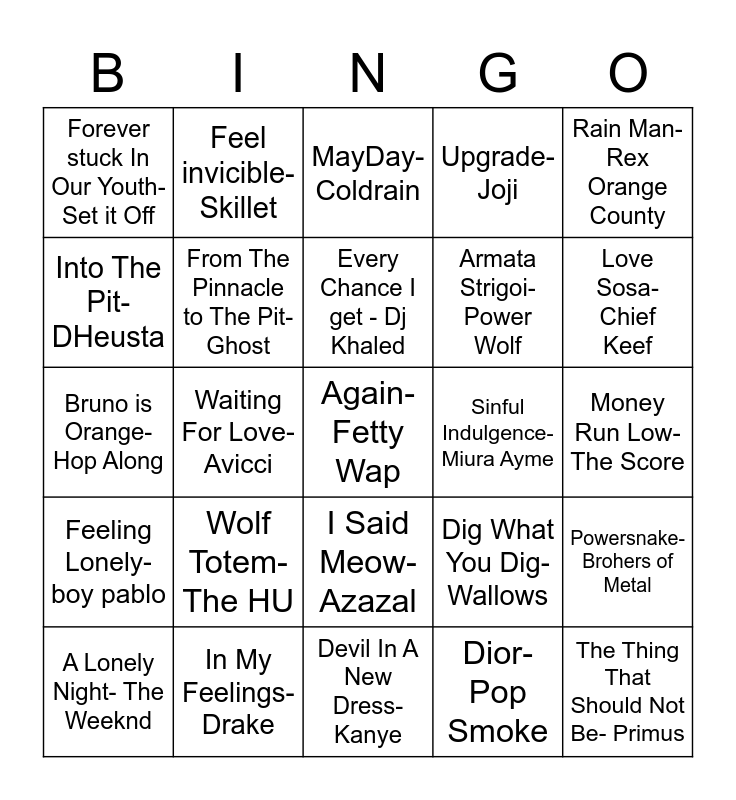 This bingo card has 25 words: Wolf Totem-The HU, Devil In A New Dress- Kanye, Every Chance I get - Dj Khaled, A Lonely Night- The Weeknd, Rain Man- Rex Orange County, Forever stuck In Our Youth- Set it Off, Into The Pit- DHeusta, Feel invicible- Skillet, Sinful Indulgence-Miura Ayme, I Said Meow- Azazal, Armata Strigoi- Power Wolf, Bruno is Orange- Hop Along, Dig What You Dig-Wallows, Powersnake-Brohers of Metal, From The Pinnacle to The Pit- Ghost, The Thing That Should Not Be- Primus, Money Run Low- The Score, MayDay- Coldrain, Love Sosa- Chief Keef, Waiting For Love- Avicci, Again- Fetty Wap, In My Feelings- Drake, Feeling Lonely- boy pablo, Upgrade-Joji and Dior- Pop Smoke.