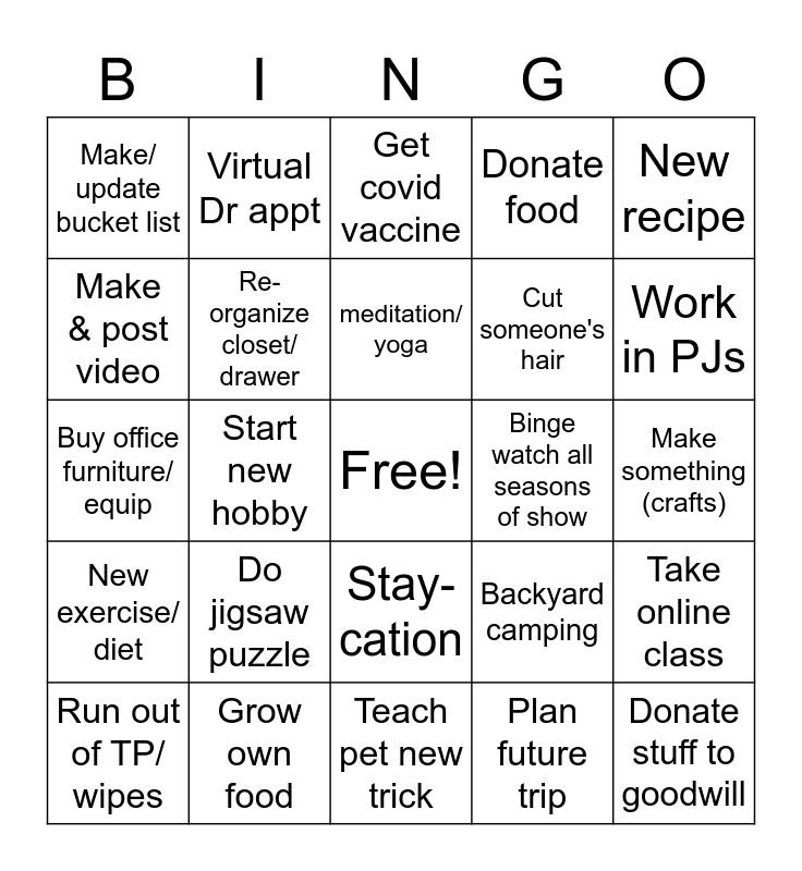 This bingo card has a free space and 32 words: Plan future trip, Home improvement/ repair, Start new hobby, Learn new skill, New exercise/ diet, Re-organize closet/ drawer, New recipe, Take online class, Virtual Dr appt, Make a mask, meditation/ yoga, Get covid vaccine, Get Groceries delivered, Videoconf w/ family/ friends, Binge watch all seasons of show, Gain/lose 10 pounds, Run out of TP/ wipes, Buy office furniture/ equip, Stay-cation, Do jigsaw puzzle, Backyard camping, Invent new game/ activity, Make something (crafts), Grow own food, Donate stuff to goodwill, Donate food, Cut someone's hair, Make & post video, Make/ update bucket list, Teach pet new trick, Stay home > week and Work in PJs.