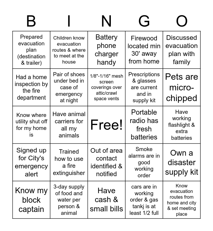 This bingo card has a free space and 25 words: Trained how to use a fire extinguisher, Have cash & small bills, 1/8"-1/16" mesh screen coverings over attic/crawl space vents, Know my block captain, Discussed evacuation plan with family, Prepared evacuation plan (destination & trailer), Had a home inspection by the fire department, Children know evacuation routes & where to meet at the house, Portable radio has fresh batteries, Out of area contact identified & notified, Prescriptions & glasses are current and in supply kit, Know where utility shut off for my home is, Smoke alarms are in good working order, Own a disaster supply kit, Pair of shoes under bed in case of emergency at night, Know CPR/ First Aid, Have working flashlight & extra batteries, Battery phone charger handy, Pets are micro-chipped, Have animal carriers for all my animals, Know evacuation routes from home and city & set meeting place, 3-day supply of food and water per person & animal, Signed up for City's emergency alert, Firewood located min 30' away from home and cars are in working order & gas tankj is at least 1/2 full.