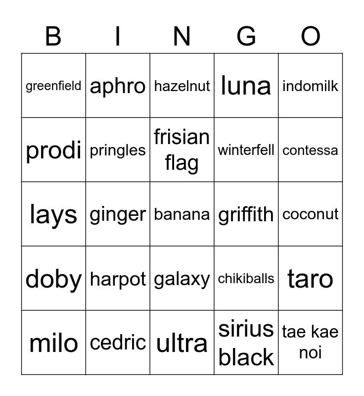This bingo card has 25 words: harpot, ultra, frisian flag, milo, indomilk, greenfield, prodi, aphro, griffith, galaxy, winterfell, lays, chikiballs, taro, pringles, tae kae noi, coconut, hazelnut, contessa, ginger, banana, cedric, doby, luna and sirius black.