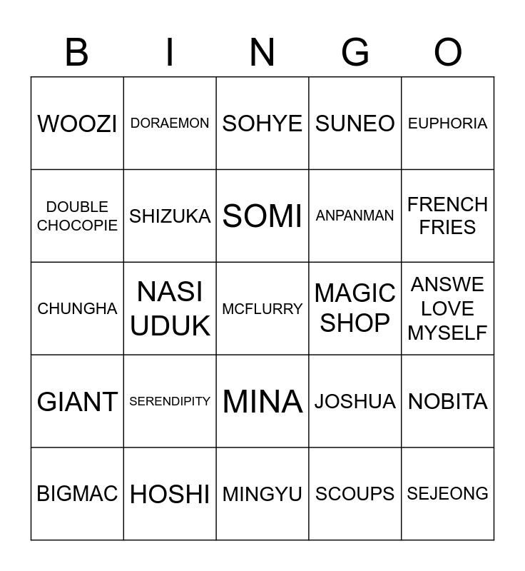 This bingo card has a free space and 24 words: SERENDIPITY, HOSHI, SOMI, BIGMAC, EUPHORIA, WOOZI, DOUBLE CHOCOPIE, DORAEMON, MAGIC SHOP, MINA, ANPANMAN, CHUNGHA, JOSHUA, NOBITA, SHIZUKA, SCOUPS, ANSWE LOVE MYSELF, SOHYE, FRENCH FRIES, NASI UDUK, SEJEONG, GIANT, SUNEO and MINGYU.