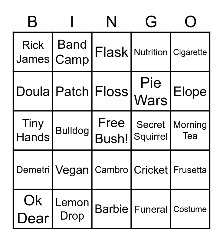 This bingo card has a free space and 25 words: Ok Dear, Vegan, Floss, Funeral, Elope, Rick James, Band Camp, Flask, Pie Wars, Frusetta, Tiny Hands, Patch, Cricket, Costume, Doula, Lemon Drop, Barbie, Nutrition, Morning Tea, Demetri, Bulldog, Cambro, Secret Squirrel, Cigarette and Cricket.
