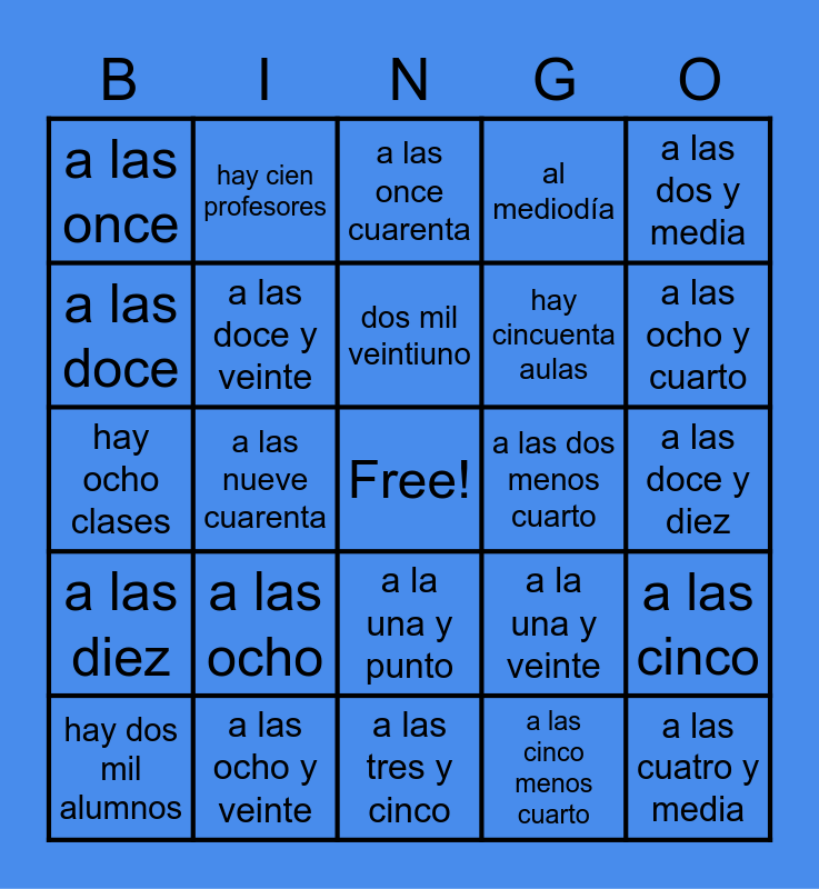 This bingo card has a free space and 30 words: a las ocho y veinte, a las nueve y punto, a las nueve cuarenta, a las diez treinta y cinco, a las once, a las once cuarenta, a las doce y veinte, a la una y punto, a las dos menos cuarto, a las tres y cinco, a las doce y diez, a las cuatro y media, a las cinco menos cuarto, a las siete, a las ocho y cuarto, a las once y media, a la una y veinte, a las diez, a las ocho, a las dos y media, hay ocho clases, hay mil trescientos alumnos, hay cien profesores, hay cincuenta aulas, a las doce, al mediodía, a las cinco, hay dos mil alumnos, dos mil veintiuno and dos mil veintidós.