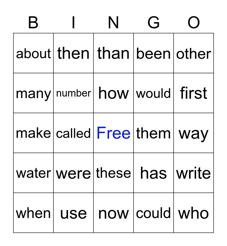 This bingo card has a free space and 24 words: were, use, how, when, other, about, many, then, them, these, would, make, has, write, number, could, way, than, first, called, who, water, been and now.