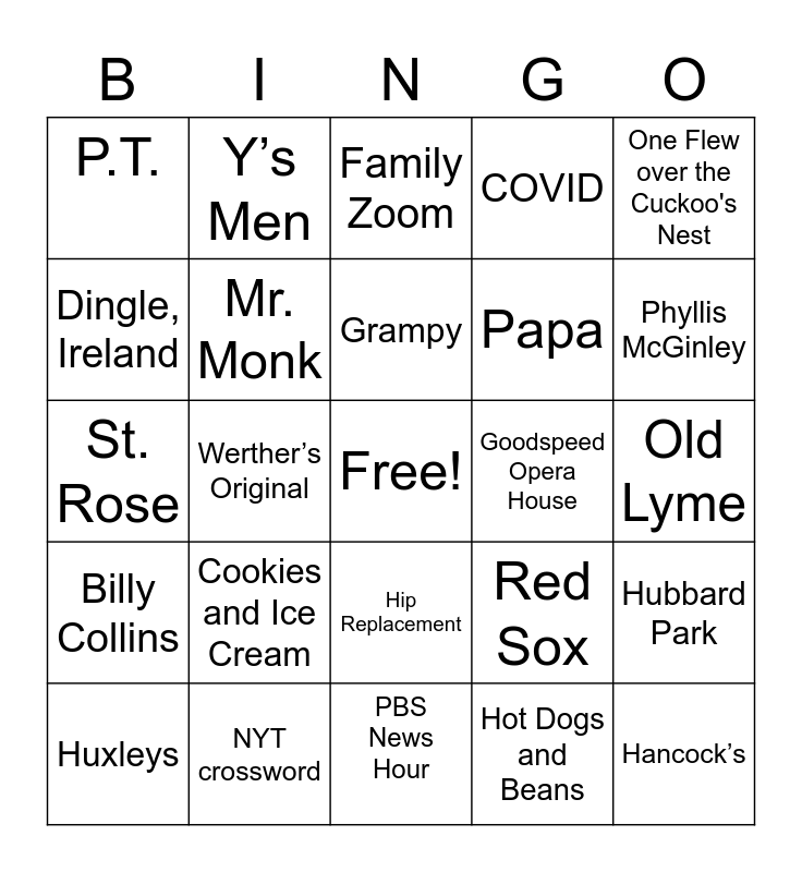 This bingo card has a free space and 24 words: Cookies and Ice Cream, NYT crossword, Grampy, Huxleys, One Flew over the Cuckoo's Nest, P.T., Dingle, Ireland, Y’s Men, Goodspeed Opera House, Hip Replacement, Papa, St. Rose, Red Sox, Hubbard Park, Mr. Monk, Hot Dogs and Beans, Old Lyme, Family Zoom, Phyllis McGinley, Werther’s Original, Hancock’s, Billy Collins, COVID and PBS News Hour.