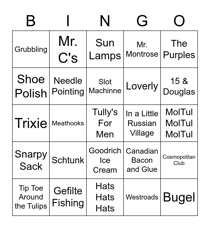This bingo card has a free space and 39 words: Twinkie, Goosey Goosey, Around the Ka Pulka Pole, Needle Pointing, Tip Toe Around the Tulips, Goodrich Ice Cream, Slot Machinne, Motorcycles, The Purples, Snarpy Sack, Meathooks, Mr. Montrose, Bugel, MolTul MolTul MolTul, In a Little Russian Village, Schtunk, Peppermill, Grubbling, Farputz, Canadian Bacon and Glue, Shoe Polish, Hats Hats Hats, Loverly, 15 & Douglas, Hilaria, Mr. Brokenfinger, Pacey, Viber Convention, Durkee Sauce, Mr. C's, Tomato Garden, Covertibles, Sun Lamps, Gefilte Fishing, Westroads, Johnny Carson Leisure Suits, Cosmopolitan Club, Trixie and Schlepper.