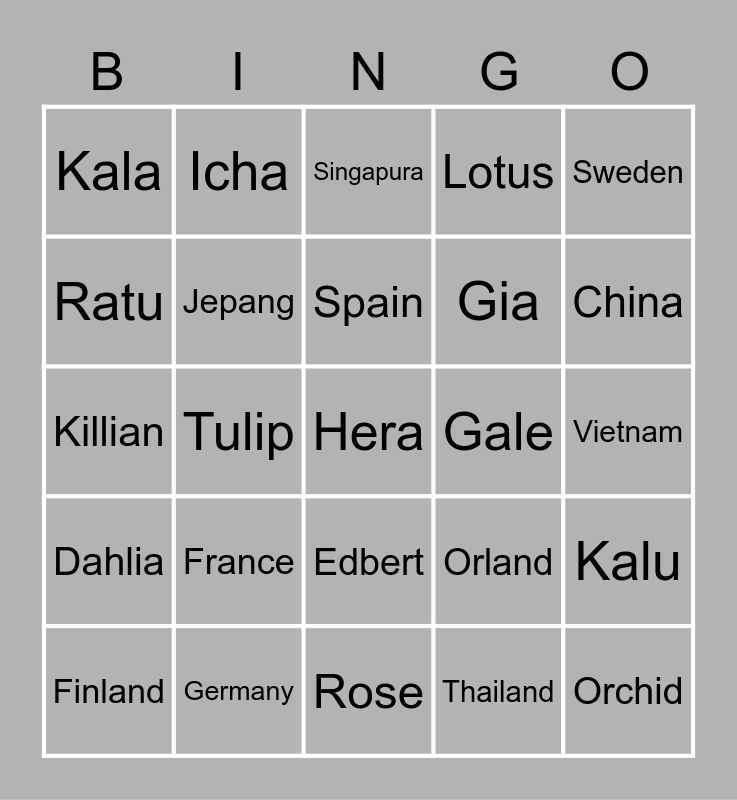 This bingo card has a free space and 24 words: France, Germany, Spain, Finland, Sweden, Kala, Ratu, Icha, Gale, Edbert, Gia, Killian, Orland, Kalu, Jepang, Thailand, Vietnam, Singapura, China, Tulip, Orchid, Dahlia, Lotus and Rose.