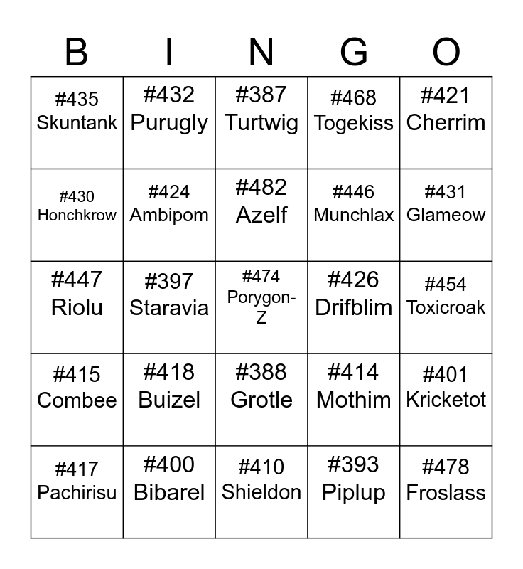 This bingo card has 25 words: #418 Buizel, #410 Shieldon, #482 Azelf, #417 Pachirisu, #421 Cherrim, #435 Skuntank, #430 Honchkrow, #432 Purugly, #426 Drifblim, #388 Grotle, #446 Munchlax, #447 Riolu, #414 Mothim, #401 Kricketot, #424 Ambipom, #478 Froslass, #454 Toxicroak, #387 Turtwig, #431 Glameow, #397 Staravia, #474 Porygon-Z, #400 Bibarel, #415 Combee, #468 Togekiss and #393 Piplup.