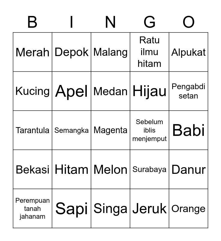 This bingo card has 25 words: Hitam, Singa, Medan, Perempuan tanah jahanam, Alpukat, Merah, Kucing, Depok, Sebelum iblis menjemput, Melon, Hijau, Tarantula, Surabaya, Danur, Apel, Orange, Babi, Malang, Pengabdi setan, Semangka, Magenta, Sapi, Bekasi, Ratu ilmu hitam and Jeruk.