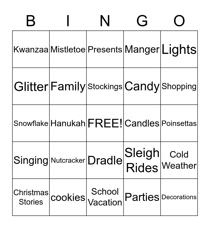 This bingo card has a free space and 24 words: Nutcracker, cookies, Stockings, Christmas Stories, Lights, Kwanzaa, Glitter, Mistletoe, Candles, Dradle, Candy, Snowflake, Sleigh Rides, Cold Weather, Family, Parties, Poinsettas, Presents, Shopping, Hanukah, Decorations, Singing, Manger and School Vacation.