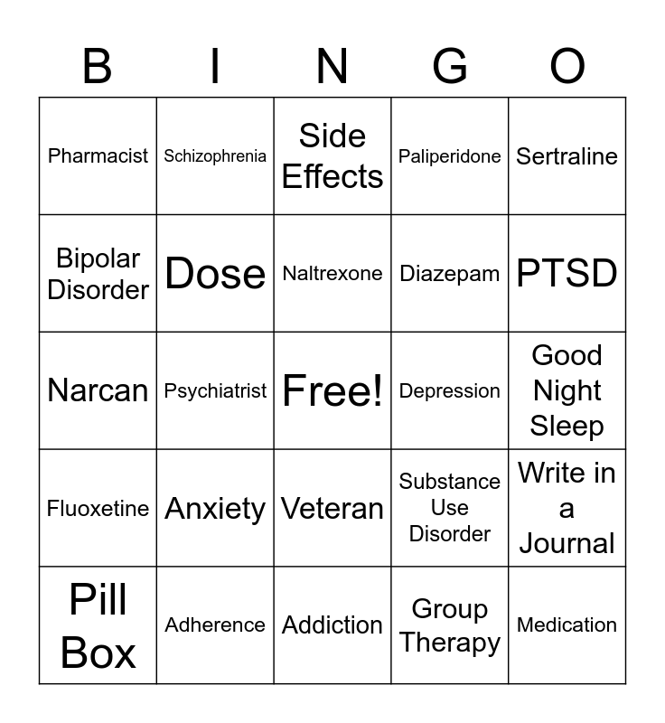 This bingo card has a free space and 29 words: Pill Box, Exercise, Psychiatrist, Social Work, Pharmacist, Side Effects, Dose, Anxiety, Depression, Adherence, Good Night Sleep, Medication, Addiction, Group Therapy, PTSD, Psychology, Veteran, Fluoxetine, Sertraline, Narcan, Substance Use Disorder, Risperidone, Diazepam, Bipolar Disorder, Paliperidone, Schizophrenia, Write in a Journal, Naltrexone and Acamprosate.