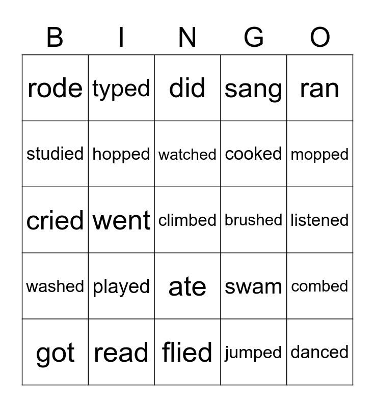 This bingo card has 25 words: played, flied, watched, got, ran, rode, studied, typed, brushed, ate, cooked, cried, swam, combed, hopped, danced, listened, did, mopped, went, climbed, read, washed, sang and jumped.