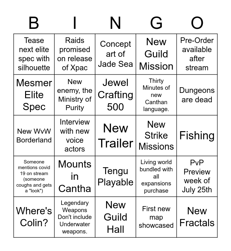 This bingo card has a free space and 24 words: Mounts in Cantha, Legendary Weapons Don't include Underwater weapons., Jewel Crafting 500, Where's Colin?, Pre-Order available after stream, Tease next elite spec with silhouette, Mesmer Elite Spec, Raids promised on release of Xpac, New Strike Missions, Tengu Playable, Thirty Minutes of new Canthan language., New WvW Borderland, Living world bundled with all expansions purchase, PvP Preview week of July 25th, New enemy, the Ministry of Purity, First new map showcased, Fishing, Concept art of Jade Sea, Dungeons are dead, Interview with new voice actors, New Fractals, Someone mentions covid 19 on stream (someone coughs and gets a "look"), New Guild Mission and New Guild Hall.