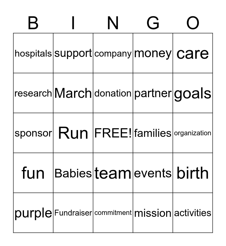This bingo card has a free space and 24 words: Babies, Fundraiser, donation, purple, care, hospitals, research, support, families, team, partner, sponsor, events, birth, March, mission, organization, company, goals, Run, activities, fun, money and commitment.