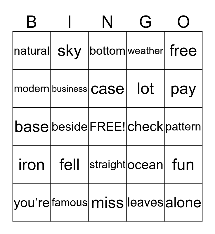 This bingo card has a free space and 43 words: suddenly, alone, correct, you’re, seven, leaves, bottom, measure, free, famous, weather, check, straight, fell, late, miss, reading, base, suppose, pay, sky, poor, hair, natural, sleep, pattern, map, mountain, ocean, iron, trouble, fun, won’t, beside, reach, store, catch, case, modern, lot, oil, business and speak.