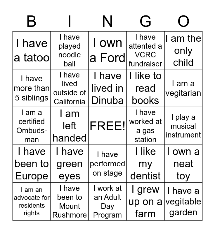 This bingo card has a free space and 24 words: I have green eyes, I have been to Mount Rushmore, I have lived in Dinuba, I am an advocate for residents rights, I am the only child, I have a tatoo, I have more than 5 siblings, I have played noodle ball, I have worked at a gas station, I have performed on stage, I like to read books, I am a certified Ombuds-man, I like my dentist, I own a neat toy, I have lived outside of California, I grew up on a farm, I play a musical instrument, I own a Ford, I am a vegitarian, I am left handed, I have a vegitable garden, I have been to Europe, I have attented a VCRC fundraiser and I work at an Adult Day Program.