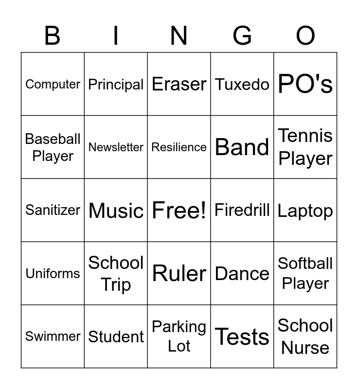 This bingo card has a free space and 85 words: Cafeteria, Chalk, Eraser, Administrator, License, Cheerleader, Child, Safety, Teamwork, Sibling, Desktop, Bookmark, Firedrill, Tennis Player, Guardian, Principal, Ruler, Band, Organized, Swimmer, Bells, Parking Lot, Dance, Transcript, Baseball Player, Contact, Messag, Football Player, Corsage, Photo ID, Student, Empathy, Emails, PO's, Sanitizer, Phone, Physical, School, Laptop, Computer, Choir, Graduate, Files, Secondary, Uniforms, Parent, Crayons, Pencil, Support, Pens, Newsletter, Resilience, Bulletin Board, Runner, Hallways, Appreciation, Bathroom Break, Tuxedo, School Nurse, Immunization, 30 Day Count, Backpack, Recess, Soccer Player, Line Up, Music, Lacrosse Player, Tests, Counseling, Mentor, Hallway Pass, Phone Directory, Flag, Wash Hands, Prom, Custody Papers, Apple, Supply, Masks, Leadership, School Trip, Elementary, Attendance, Softball Player and Birth certificate.
