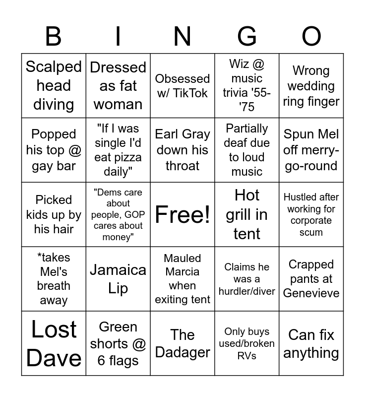 This bingo card has a free space and 24 words: Jamaica Lip, Green shorts @ 6 flags, Earl Gray down his throat, Lost Dave, Wrong wedding ring finger, Scalped head diving, Popped his top @ gay bar, Dressed as fat woman, Hot grill in tent, Mauled Marcia when exiting tent, Partially deaf due to loud music, Picked kids up by his hair, Claims he was a hurdler/diver, Crapped pants at Genevieve, "If I was single I'd eat pizza daily", Only buys used/broken RVs, Hustled after working for corporate scum, Obsessed w/ TikTok, Spun Mel off merry-go-round, "Dems care about people, GOP cares about money", Can fix anything, *takes Mel's breath away, Wiz @ music trivia '55-'75 and The Dadager.