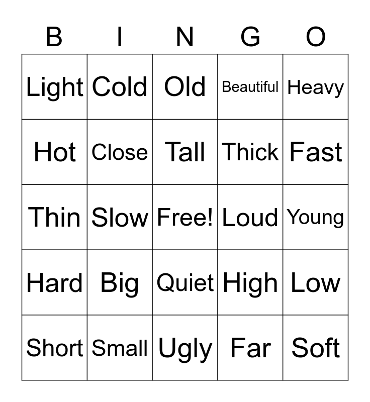 This bingo card has a free space and 24 words: Big, Small, Tall, Short, Heavy, Light, Hot, Cold, Loud, Quiet, Thick, Thin, High, Low, Close, Far, Young, Old, Fast, Slow, Soft, Hard, Beautiful and Ugly.