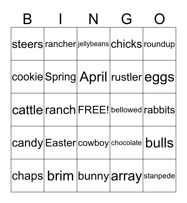 This bingo card has a free space and 24 words: Easter, brim, April, chaps, roundup, steers, cookie, rancher, bellowed, cowboy, rustler, cattle, chocolate, bulls, Spring, array, rabbits, jellybeans, eggs, ranch, stanpede, candy, chicks and bunny.
