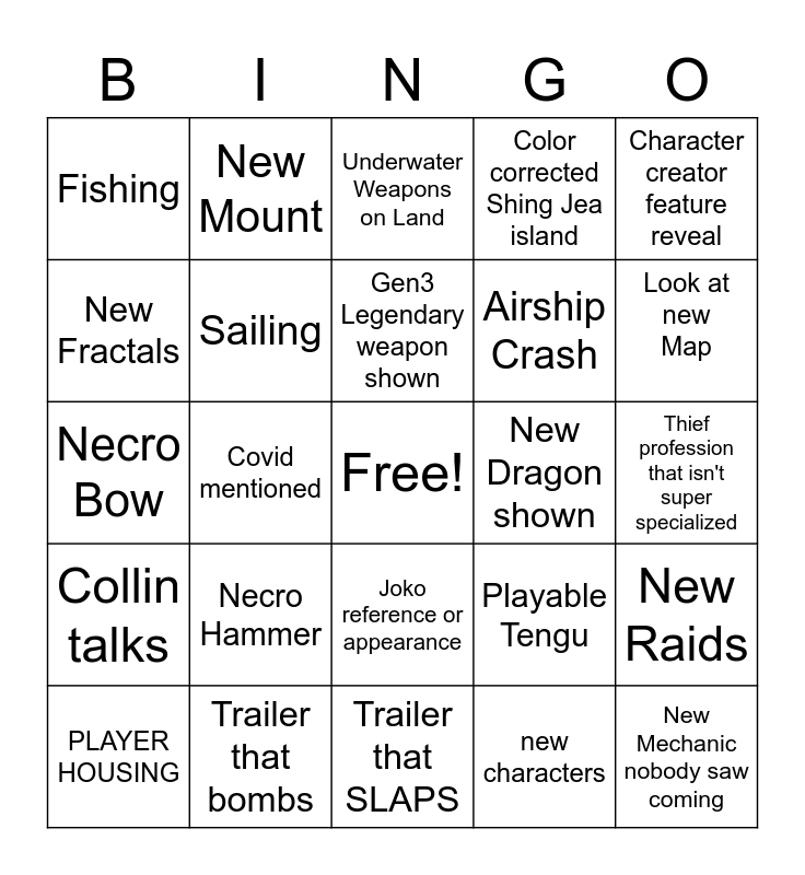 This bingo card has a free space and 24 words: PLAYER HOUSING, Necro Hammer, Gen3 Legendary weapon shown, new characters, Character creator feature reveal, Fishing, New Mount, Underwater Weapons on Land, New Dragon shown, Thief profession that isn't super specialized, Necro Bow, Sailing, Playable Tengu, New Raids, New Fractals, Trailer that bombs, Trailer that SLAPS, Color corrected Shing Jea island, Look at new Map, Collin talks, Covid mentioned, Joko reference or appearance, Airship Crash and New Mechanic nobody saw coming.