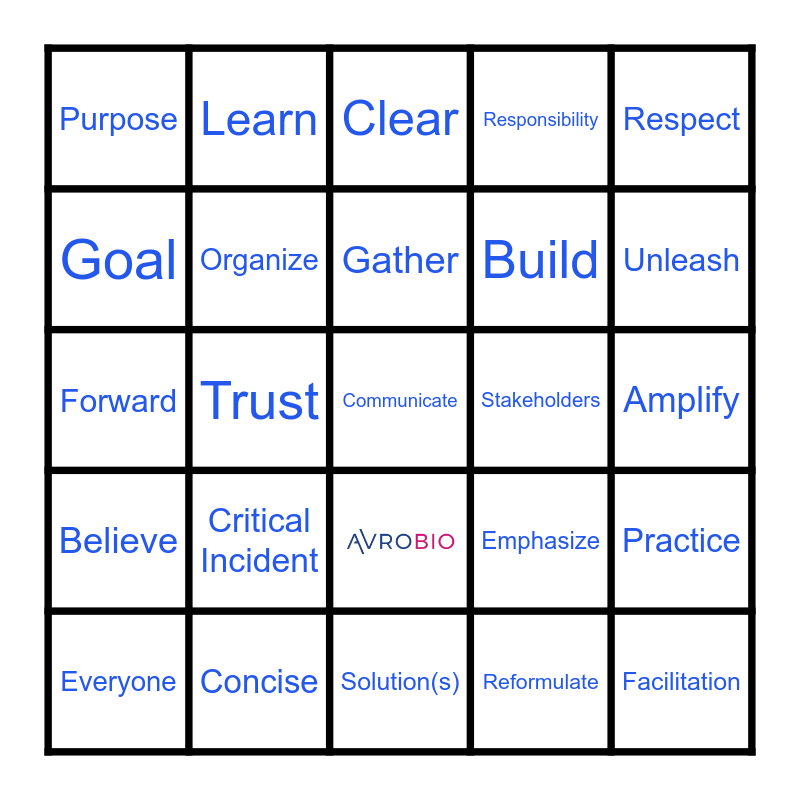 This bingo card has 1 images and 25 words: Reformulate, Gather, Concise, Respect, Purpose, Goal, Learn, Amplify, Emphasize, Build, Forward, Practice, Everyone, Trust, Group, Responsibility, Believe, Clear, Communicate, Unleash, Solution(s), Stakeholders, Critical Incident, Organize and Facilitation.