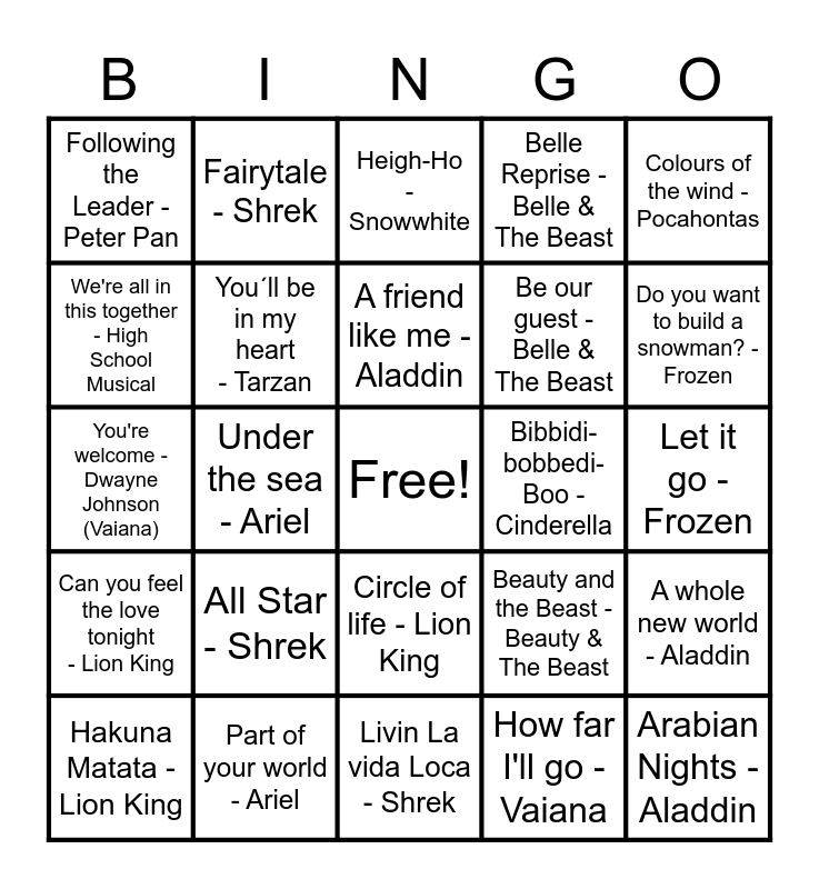 This bingo card has a free space and 26 words: Circle of life - Lion King, How far I'll go - Vaiana, A friend like me - Aladdin, Part of your world - Ariel, Colours of the wind - Pocahontas, Following the Leader - Peter Pan, We're all in this together - High School Musical, Fairytale - Shrek, Let it go - Frozen, Beauty and the Beast - Beauty & The Beast, Be our guest - Belle & The Beast, You're welcome - Dwayne Johnson (Vaiana), A whole new world - Aladdin, Hakuna Matata - Lion King, Under the sea - Ariel, Als je van beren leren kan - Jungle Boek, Belle Reprise - Belle & The Beast, Can you feel the love tonight - Lion King, Heigh-Ho - Snowwhite, Arabian Nights - Aladdin, Do you want to build a snowman? - Frozen, Livin La vida Loca - Shrek, Bibbidi-bobbedi-Boo - Cinderella, All Star - Shrek, You´ll be in my heart - Tarzan and Remember me - Coco.