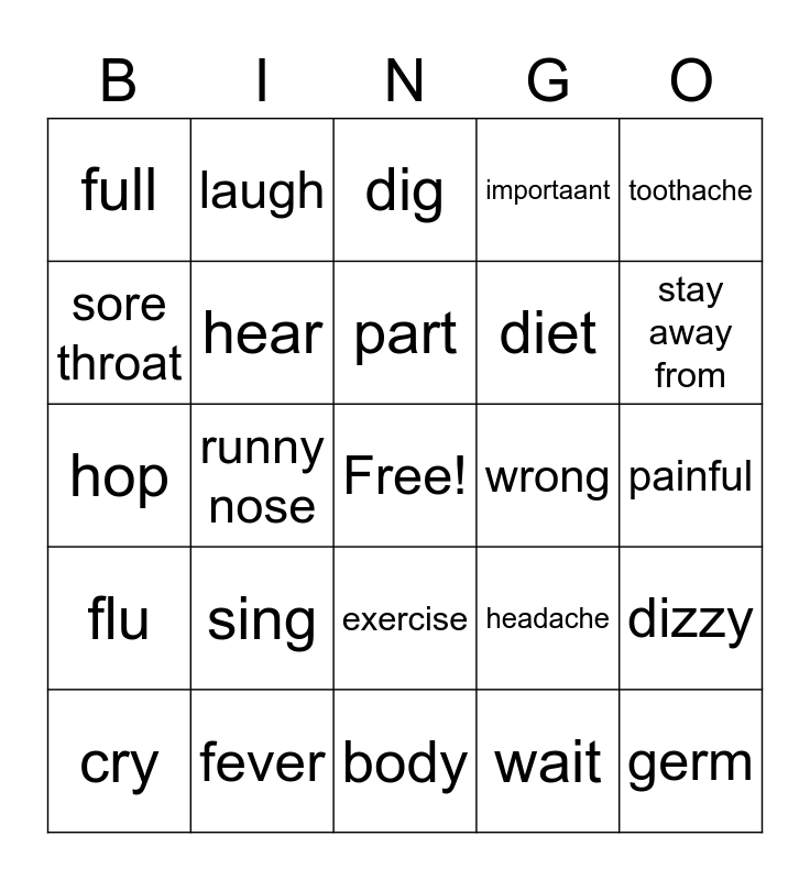 This bingo card has a free space and 24 words: cry, sing, part, wait, toothache, full, laugh, dig, wrong, painful, hop, hear, headache, dizzy, sore throat, fever, body, importaant, stay away from, flu, runny nose, exercise, diet and germ.