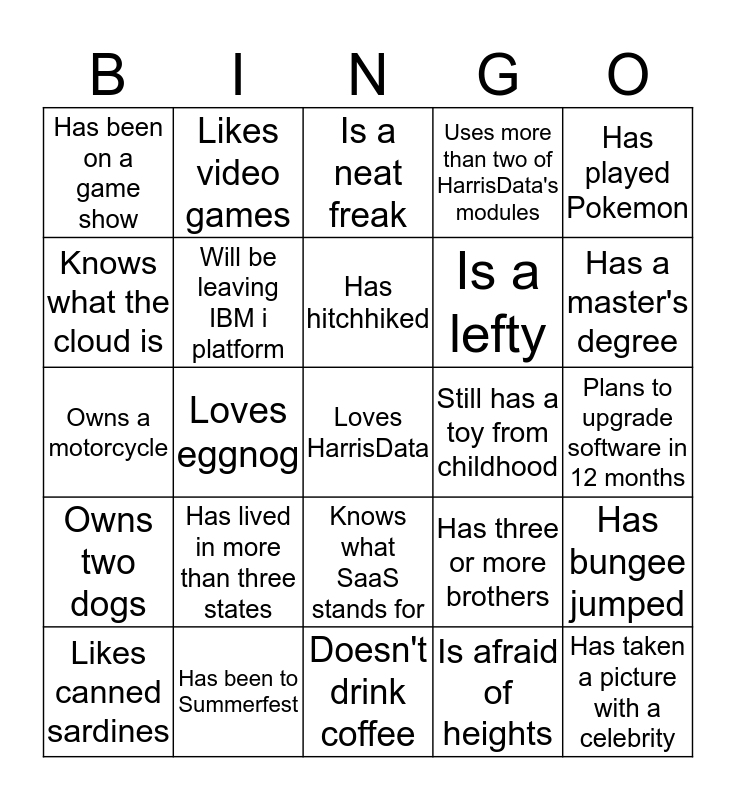 This bingo card has a free space and 24 words: Has lived in more than three states, Has been to Summerfest, Has hitchhiked, Likes canned sardines, Has played Pokemon, Has been on a game show, Knows what the cloud is, Likes video games, Still has a toy from childhood, Knows what SaaS stands for, Is a lefty, Owns a motorcycle, Has three or more brothers, Has bungee jumped, Will be leaving IBM i platform, Is afraid of heights, Plans to upgrade software in 12 months, Is a neat freak, Has a master's degree, Loves eggnog, Has taken a picture with a celebrity, Owns two dogs, Uses more than two of HarrisData's modules and Doesn't drink coffee.