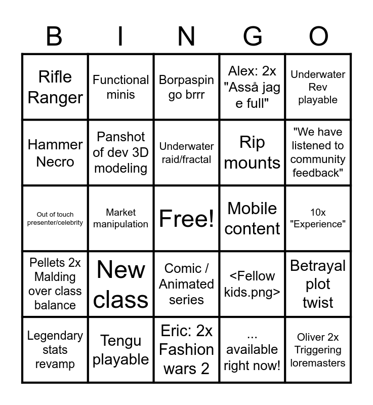 This bingo card has a free space and 24 words: New class, Tengu playable, Underwater raid/fractal, Legendary stats revamp, Underwater Rev playable, Rifle Ranger, Hammer Necro, Functional minis, Mobile content, Comic / Animated series, Rip mounts, Out of touch presenter/celebrity, <Fellow kids.png>, Betrayal plot twist, Panshot of dev 3D modeling, ... available right now!, 10x "Experience", Borpaspin go brrr, "We have listened to community feedback", Market manipulation, Oliver 2x Triggering loremasters, Pellets 2x Malding over class balance, Alex: 2x "Asså jag e full" and Eric: 2x Fashion wars 2.