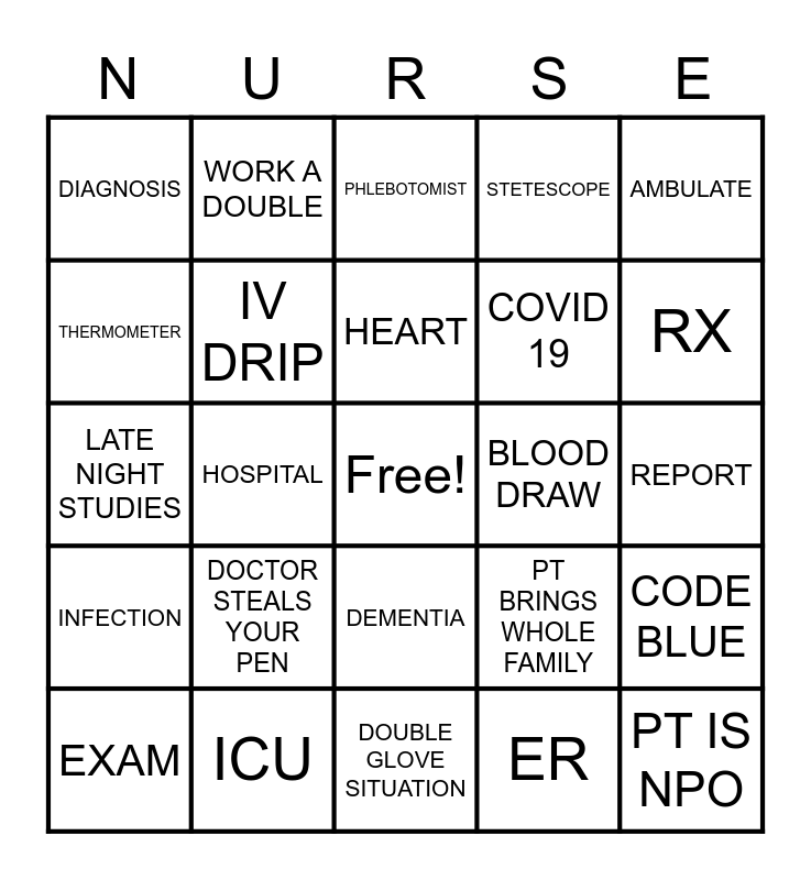 This bingo card has a free space and 49 words: SHOT, PT IS NPO, PT FORGOT WHY THEY RANG THE CALL BIUTTON, DOUBLE GLOVE SITUATION, DOCTOR STEALS YOUR PEN, SPONGE BATH, WORK A DOUBLE, SCRUBS, THERMOMETER, GET PULLED TO ANOTHER FLOOR, IV DRIP, STETESCOPE, CODE BLUE, PT BRINGS WHOLE FAMILY, BONES, CHART, HEART, BLOOD DRAW, WOUND CARE, AMBULATE, HOSPITAL, ER, DIAGNOSIS, COVID 19, NEEDLE, RX, EXAM, FULL CODE, DEMENTIA, INFECTION, BLOOD PRESSURE, HOME HEALTH, INFLAMATION, LETHARGIC, ICU, XRAY, DUTIES, ON CALL, REPORT, DOCTOR, NURSE, TOURNIQUET, LABORATORY, GRAVEYARD, LATE NIGHT STUDIES, PHLEBOTOMIST, NCLEX, COFFEE JUNKIE and HEADACHE.