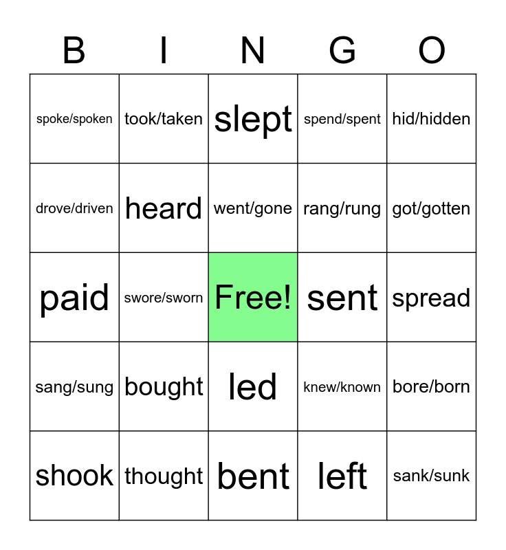 This bingo card has a free space and 40 words: made, paid, froze/frozen, heard, thought, led, went/gone, rose/risen, hid/hidden, sang/sung, swore/sworn, spend/spent, sank/sunk, spread, sent, bought, ran/run, spoke/spoken, broke/broken, slept, bore/born, left, rang/rung, drove/driven, woke/woken, caught, stuck, felt, swept, gave/given, forgave/forgiven, shook, stole/stolen, knew/known, got/gotten, bent, was/were/been, fought, took/taken and swam/swum.