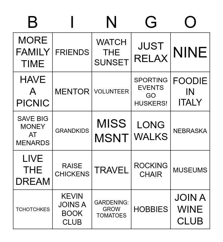 This bingo card has a free space and 24 words: RAISE CHICKENS, KEVIN JOINS A BOOK CLUB, VOLUNTEER, TCHOTCHKES, NINE, MORE FAMILY TIME, HAVE A PICNIC, FRIENDS, LONG WALKS, TRAVEL, SPORTING EVENTS GO HUSKERS!, SAVE BIG MONEY AT MENARDS, ROCKING CHAIR, MUSEUMS, MENTOR, HOBBIES, NEBRASKA, WATCH THE SUNSET, FOODIE IN ITALY, GRANDKIDS, JOIN A WINE CLUB, LIVE THE DREAM, JUST RELAX and GARDENING: GROW TOMATOES.