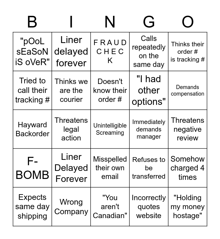 This bingo card has a free space and 24 words: Liner Delayed Forever, Wrong Company, Doesn't know their order #, Expects same day shipping, Thinks their order # is tracking #, "pOoL sEaSoN iS oVeR", Tried to call their tracking #, Liner delayed forever, Immediately demands manager, Misspelled their own email, "I had other options", Hayward Backorder, Refuses to be transferred, Somehow charged 4 times, Thinks we are the courier, Incorrectly quotes website, Threatens negative review, F R A U D C H E C K, Demands compensation, Threatens legal action, "Holding my money hostage", F- BOMB, Calls repeatedly on the same day and "You aren't Canadian".