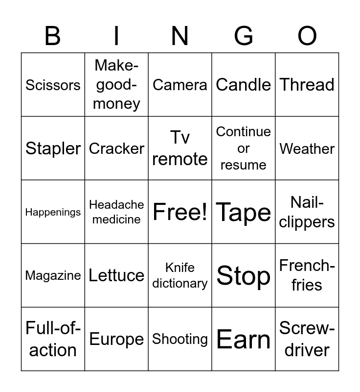 This bingo card has a free space and 37 words: Sugar, Ice-cream, Cookie, Cracker, French-fries, Lettuce, Tv remote, Matches, Thread, Soup, Headache medicine, Candle, Screw-driver, Nail-clippers, Stapler, Magazine, Towel, Camera, Knife dictionary, Tape, Scissors, Weather, Full-of-action, Shooting, Send-electronically, Earn, Make-good-money, Debate, Hire, Pain, Suppose, Europe, Happenings, Excuse-me, Stop, Continue or resume and It’s-nothing.