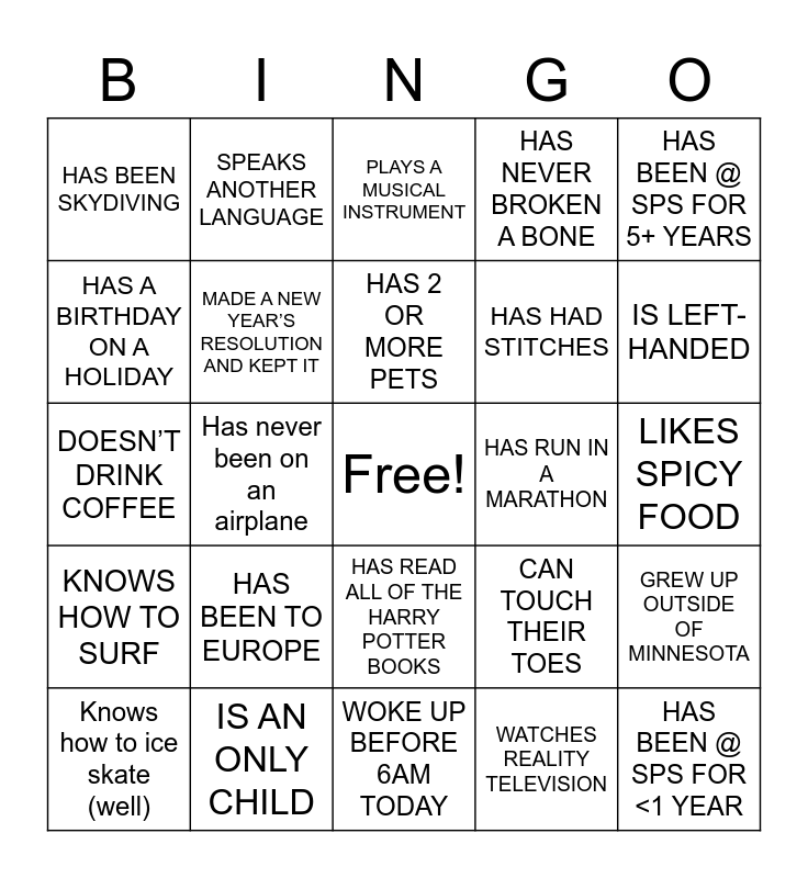 This bingo card has a free space and 24 words: HAS BEEN TO EUROPE, IS AN ONLY CHILD, HAS 2 OR MORE PETS, Knows how to ice skate (well), HAS BEEN @ SPS FOR 5+ YEARS, HAS BEEN SKYDIVING, HAS A BIRTHDAY ON A HOLIDAY, SPEAKS ANOTHER LANGUAGE, HAS RUN IN A MARATHON, HAS READ ALL OF THE HARRY POTTER BOOKS, HAS HAD STITCHES, DOESN’T DRINK COFFEE, CAN TOUCH THEIR TOES, GREW UP OUTSIDE OF MINNESOTA, MADE A NEW YEAR’S RESOLUTION AND KEPT IT, WATCHES REALITY TELEVISION, LIKES SPICY FOOD, PLAYS A MUSICAL INSTRUMENT, IS LEFT-HANDED, Has never been on an airplane, HAS BEEN @ SPS FOR <1 YEAR, KNOWS HOW TO SURF, HAS NEVER BROKEN A BONE and WOKE UP BEFORE 6AM TODAY.