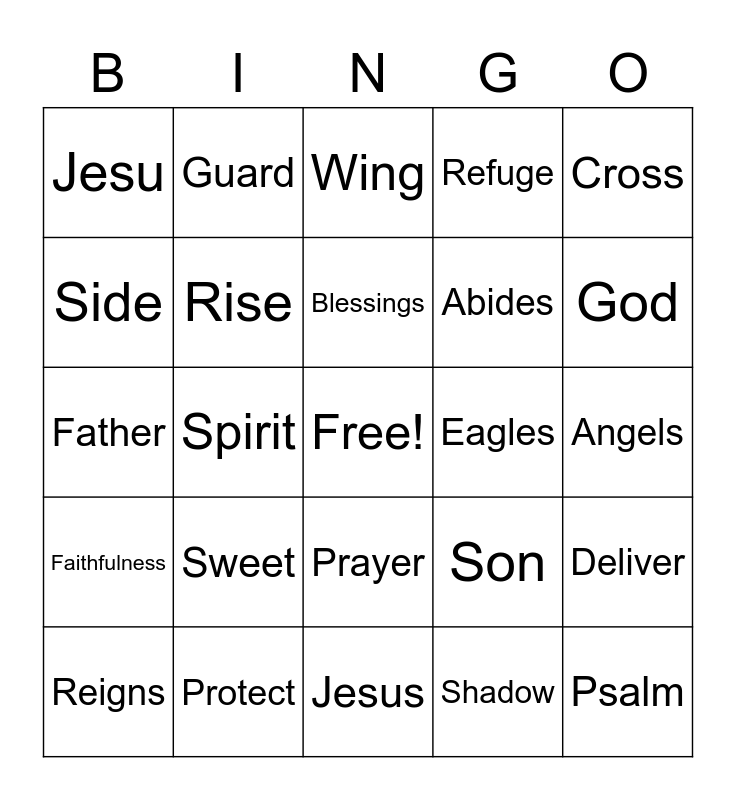 This bingo card has a free space and 29 words: Reigns, Mother's, Spirit, Melt, Jesu, Wing, Rise, Sweet, Eagles, Protect, Angels, Psalm, Jesus, Shadow, God, Soul, Prayer, Faithfulness, Cross, Father, Son, Heaven, Abides, Side, Refuge, Guard, Deliver, Blessings and Creatures.